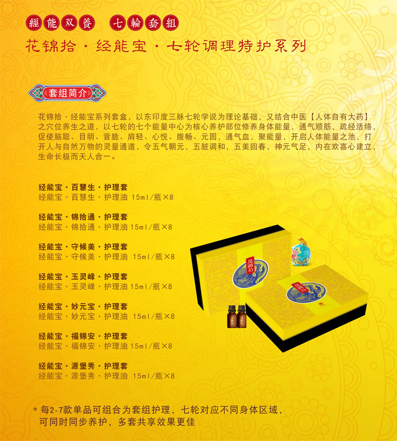 您的位置:首頁 > 品牌介紹 > 花錦拾 > 花錦拾·經(jīng)能寶七輪調理特護系列